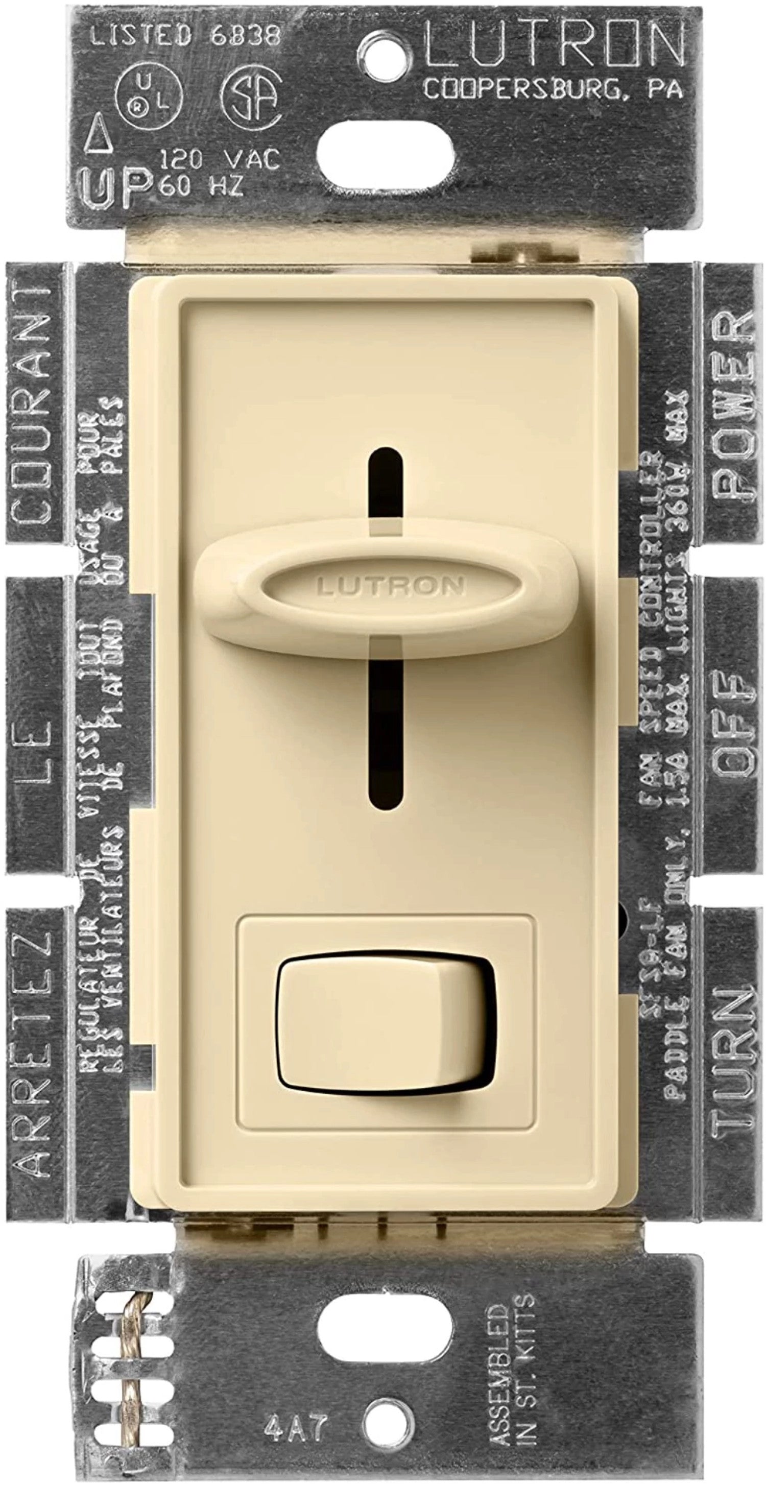 Lutron Skylark fan controls are designed to replace or match your traditional toggle style switches. This combination control can be used to operate both light and fan from a single switch – no need for two separate controls for the light and the fan. Use the slider on the left to adjust your fan between 3 quiet speeds and use the slider on the right to adjust your light level. The toggle switch only controls the lights ON/OFF, allowing you to turn on the fan without /having to turn on the lights. The Skylark combination fan and light control fits into a traditional wall plate opening and can also work with your existing multi-gang wall plates. Available in 5 gloss colors. Pairs perfectly with Lutron Claro wall plates for consistent color matching (sold separately).